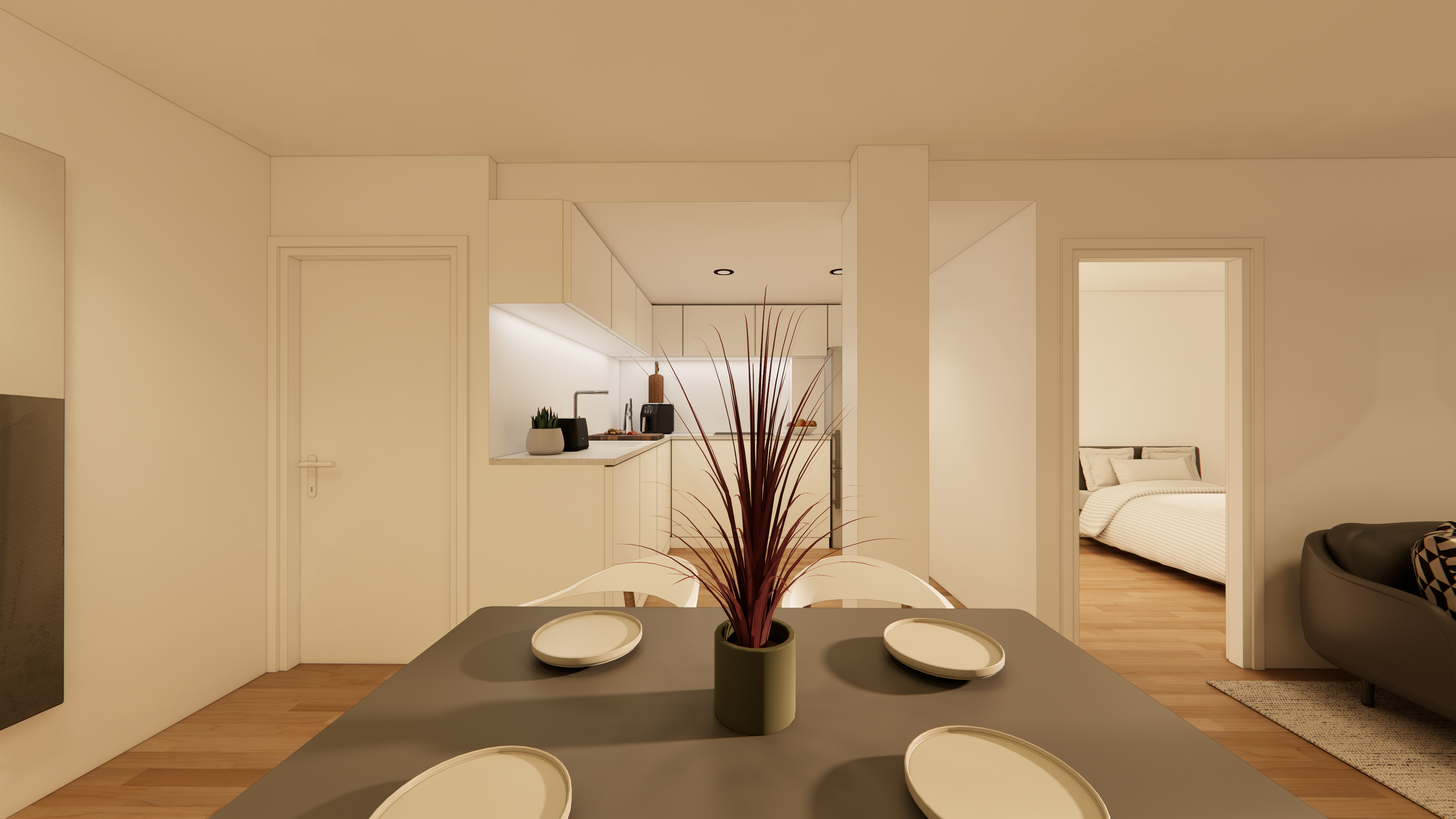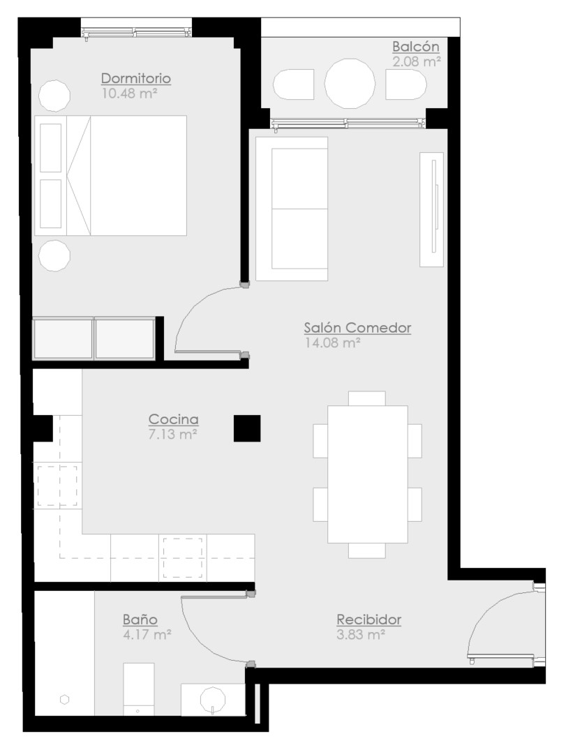 Documentación orientativa, tanto en su parte gráfica como los datos referidos a superficies, sin perjuicio de la información más exacta contenida en la documentación técnica del proyecto. No vinculante ni contractual, pudiendo sufrir modificaciones por requerimientos comerciales, jurídicos, técnicos o de ejecución del proyecto. Todo el mobiliario mostrado, incluido el de cocina, es únicamente orientativo y con efectos decorativos. Las imágenes 3D mostradas no tienen valor contractual.